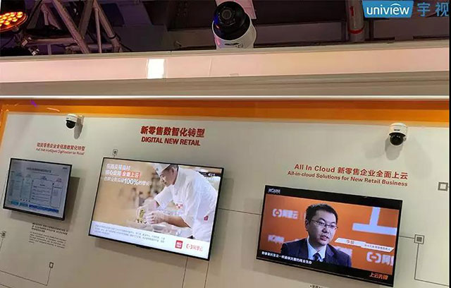 这块震撼吸睛的超大高清LED屏幕,正是宇视所部署,除此之外,宇视还于新零售展区部署多台智能摄像机,精工呈现阿里云循迹方案。