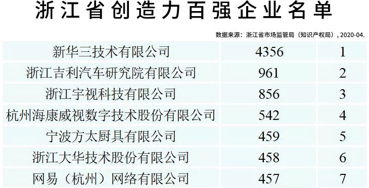 2020年4月,浙江省以企业持有的有效发明专利为主要指标,首次发布《浙江省创造力百强企业名单》。有效发明专利拥有量500件以上的的企业有4家,分别为新华三技术有限公司、浙江吉利汽车研究院有限公司、半岛BD体育官网在线观看 、杭州海康威视数字技术股份有限公司,浙江大华技术股份有限公司以458件专利位居第6位。
