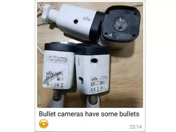 其中一次的“陪跑”经历是2019年3月,也门荷台达遭遇暴乱。M恰好在去拜访客户的路上,一颗打歪的子弹正好越过他,击中了头顶的宇视摄像机。惊魂未定的他扭着身子钻进防空洞的同时,看到里面同样避难的人潮,也不后怕了,站上一块高地就开始给大家介绍宇视的产品。