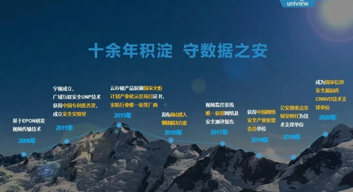 宇视持续践行视频安全技术创新,先后获得国家信息安全中心、国家密码管理局和相关部检测机构等权威机构认证以及30项以上的安全创新专利,首批获得GB35114证书。宇视独创的UNP技术方案获国家知识产权局和世界知识产权组织授予的中国专利优秀奖,成为国家信息安全漏洞库(CNNVD)支撑单位。