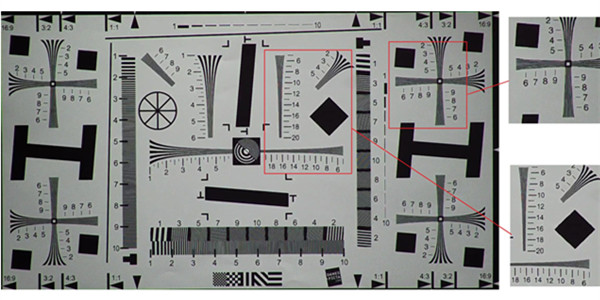上图为分辨率测试该款球机支持200万高清分辨率,将球机对准测试卡,通过软件可以测得,广角模式下该款球机中心分辨率达到1121TVL,边缘990TVL,画面边缘无畸变,画面整体效果较好。