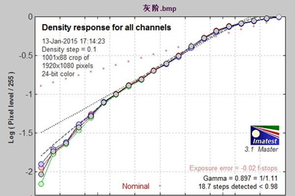 上图为灰阶测试将球机对准20级灰阶测试卡,通过软件分析灰阶色卡该球机可以分辨到18.7级,色阶分辨能力表现优秀。