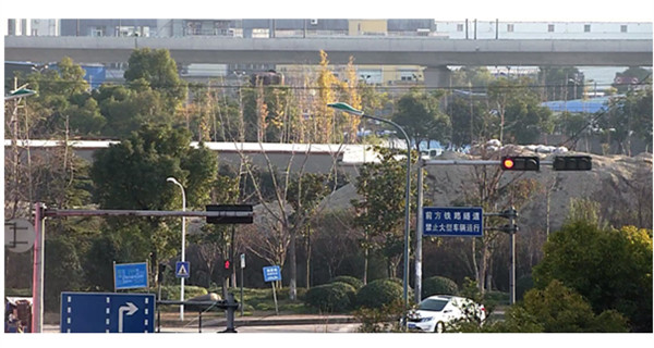 1)白天场景测试测试白天场景选取了一个有路牌、红绿灯、立交桥、多层次树木的路口复杂场景来验证球机的场景适应性。在球机转动到该场景,画面迅速聚焦清晰,远方的路牌、汽车、树叶、红绿灯颜色还原真实自然,画面层次感较好,路牌文字及树木细节非常清晰,画图通透感较好,白天画面整体效果表现不错。