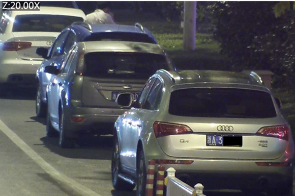2)夜晚低照场景测试夜晚将球机放到20倍最长焦,远处车辆画面清晰、色彩自然、画面通透,整体画面在长焦下无抖动,车牌可以清晰读取,夜晚低照下监控效果优秀。