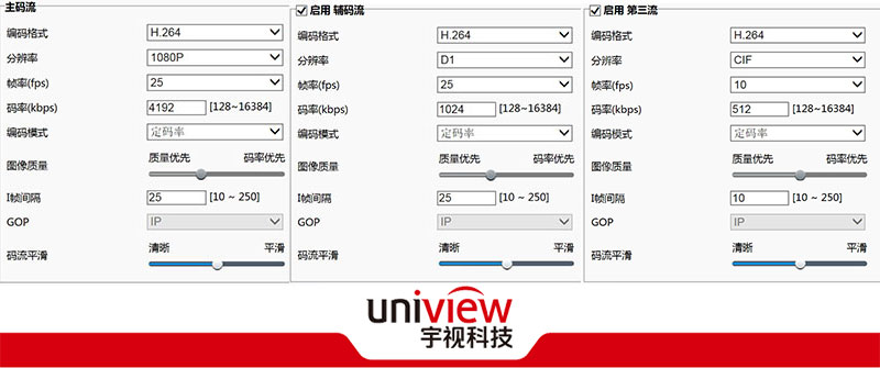 宇视分销IPC支持主流、辅流、第三流三种不同帧率、码率、分辨率的码流编码