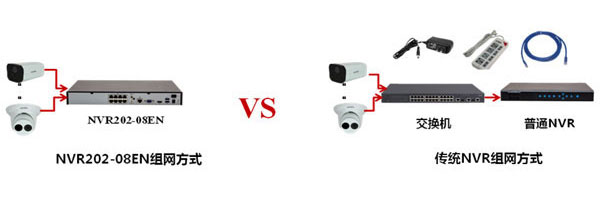 IPC直接接入到NVR202-08EN的8个百兆网口后, IP地址自动分配出图像,简单易操作,节省操作时间。普通NVR需要在“搜索、添加”功能设置中修改IP地址。