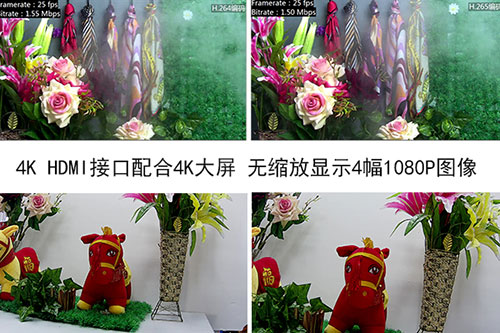 宇视分销领先NVR308-32E具备3个高清输出接口,其中一个HDMI接口支持4K分辨率的输出。实际应用时,4K HDMI接口配合4K大屏可以无缩放显示4幅高清1080P图像。每一幅图像都具备完整的1920×1080分辨率,总分辨率达到3840×2160。