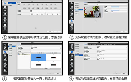 宇视分销NVR全新界面推广以来,以其‘更合理的布局、更精炼的配置、更舒适的界面风格’给用户带来更人性化的体验,受到了全国各地客户的高度赞扬。新界面中用户进行某小功能配置时可以看到所有大功能,方便切换;老界面进行功能配置时必须逐层进入,如果需要切换其他功能配置,必须退出之前的界面再进入。