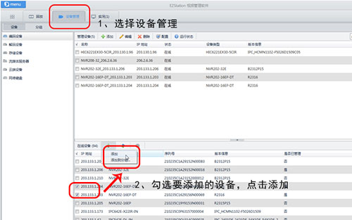 EZStation支持自动搜索所有在线NVR设备,并快速添加。同时支持自动添加NVR设备下的摄像机,如果设备地址遗忘,连接网络,搜索成功后即可直接修改。除此之外,EZStation还能统一管理流媒体服务器、解码器等。