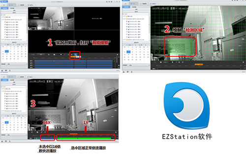 EZStation实现从海量数据中快速提取有效数据,提高检索效率。使用方式:用户选定检索区域后,系统对选区内的录像进行智能分析,判断检索区域是否存在物体运动,同时用不同的颜色区块标识出来,快速检索。另外,用户如需查看特定时段录像,也可进行选定设置,非检索录像会以16倍数的快进速度进行回放;符合检索条件的录像则会以正常倍数进行播放。