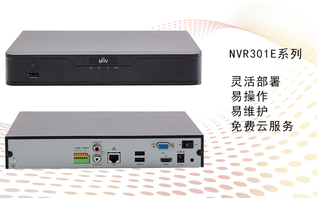 新年伊始,宇视面向家庭、超市、商店等中小型应用场景推出SMB(Small Medium Business中小商业客户)产品H.265 NVR301E系列:采用全新设计,实现6种不同IPC添加方式,更灵活;预览界面通道互换,更人性化;无需PC机便可进行升级服务,更便捷;免费云服务,三种图像模式任君选择,提升用户的操作体验。