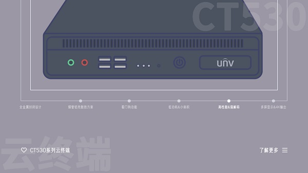 宇视新一代云终端设备CT530系列基于高集成和低功耗的一体化架构,让电脑桌面平台在性能和平台应用上都有了更多的可能性。