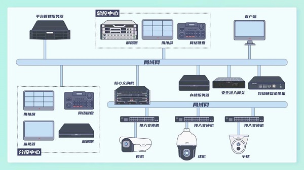 管理中心部署VM3500视频管理服务器、VMS存储一体机、A8视频综合平台、控制键盘,实现近千路视频的接入及整个系统的统一管理,可支持视频查看/管理、报警联动、移动管理等多种业务应用。