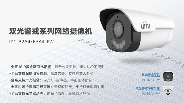 宇视通用智能型双光警戒系列网络摄像机,支持多种智能应用,支持声光告警,支持双向语音对讲,可适用居民小区、鱼塘、果园等场景,让安全更加简单。