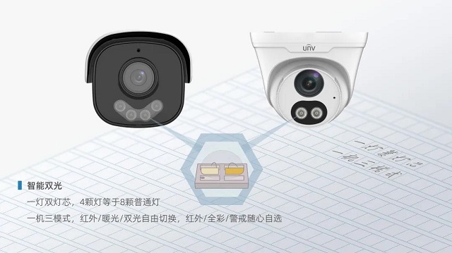 双光警戒系列IPC应用了双灯芯设计,一灯双灯芯,4颗灯相当于4颗普通红外灯+4颗普通暖光灯;一机三模式,一台更顶三台用,红外/白光/智能双光三种模式自由切换。