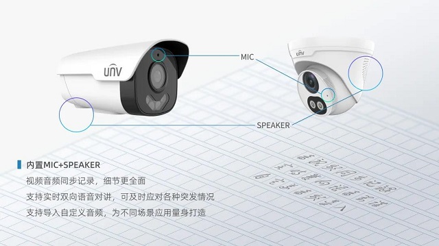 双光警戒系列IPC内置MIC+SPEAKER,视频音频同步记录,支持双向实时语音对讲,可及时应对各种突发情况,还支持自定义音频导入,有效适应各种不同场景需求。