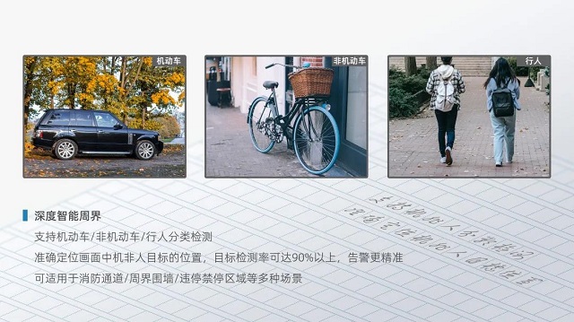 相对于泛智能周界,深度周界还支持机非人分类检测,同时能将报警图片在前端Web界面进行显示,可应用于消防通道、周界围墙、违停禁停区域等丰富场景。