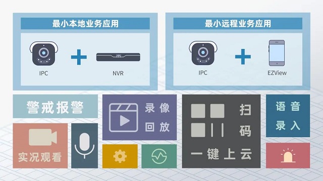双光警戒系列IPC搭配NVR,即可实现本地极简方案;搭配EZView,即可成为远程极简方案,轻松实现声光告警、语音对讲、实况查看、录像回放等业务应用。
