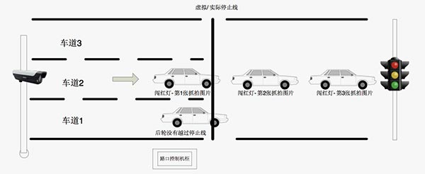 其实对于闯红灯违法过程抓拍在GA/T496-2014《闯红灯自动记录系统通用条件》有明确的规定,闯红灯自动记录系统应能至少记录以下3张反映闯红灯行为过程的图片(: a)能反映机动车未到达停止线的图片,并能清晰辨别车辆类型、交通信号灯红灯、停止线;(b)能反映机动车已越过停止线的图片,并能清晰辨别车辆类型、号牌号码、交通信号灯红灯、停止线;(c)能反映机动车与(b)图片中机动车向前位移的图片,并能清晰辨别车辆类型、交通信号灯红灯、停止线。所以只要机动车违反交通信号灯红灯亮时禁止通行的规定,越过停止线并继续行驶,非现场执法系统就会按照规定中的要求对违法车辆自动采集三张高清图片,记录车辆闯红灯动态过程。