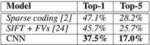 2012年,多伦多大学Geoff Hinton的两个博士生Alex Krizhevsky 和IlyaSutskever 在NIPS 上发表论文《ImageNetClassification with Deep ConvolutionalNeural Networks》[2],采用深度卷积网络算法,在图片分类竞赛ImageNet 中的大规模视觉识别挑战赛ILSVRC-2010和ILSVRC-2012上(如图1和图2所示),图片分类结果均拿到了第一名,并且相比于传统的手工特征的最好的算法(SIFT+Fisher Vectors)的分类结果(top-1错误率和top 错误率)减少近10% !(注图1和图2中斜体为最好的手工特征算法结果,粗体为CNN 结果,带星号的为神经网络结构经过“预训练”了的分类结果)要知道,在过去竞赛中,使用传统手工特征的形形色色算法的结果提升幅度从没有这么高。可想而知,这在计算机视觉(computer vision)领域引起地震。同时也拉开了CNN 在计算机视觉领域以及其他领域大量运用,以及CNN网络结构快速发展的大幕。