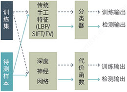 深度学习是机器学习的一个分支。机器学习的目的是根据在训练数据集上每个样本的目标值,学习得到一个模型。训练时,对分类器输出和目标值进行对比,根据使用的分类器和代价函数(或损失函数,lossfunction),使用优化算法,反复迭代,不断调整参数,直到算法收敛为止。检测时使用该模型用于新的样本,模型的输出就是我们需要的输出。如图4所示。相比于检测过程(或测试过程),训练过程需要反复迭代,运算量极大。传统手工设计特征的表现能力远远不及神经网络的抽象表达能力。这就是神经网络,尤其是深度神经网络的优势所在。