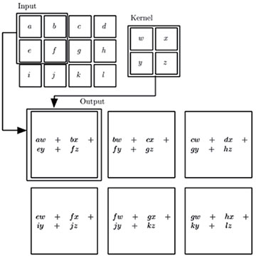 属于卷积神经网络(convolutional neural networks 或CNN)家族的各种结构神经网络主要用于处理网格结构数据,比如时间序列数据(音频)可以看成为按照一定时间间隔采样而成的1D 网格数据;图像可以看成由像素组成的3D 网格数据;视频可以看成是由按照时间采样的2D 图像组成的3D 网格数据;视频和光流可以是由2D 图像加1D 光流按照时间采样的4D 网格数据;等等。卷积神经网络主要的操作就是卷积,如图5 [3] 所示为2D 卷积原理示意图。卷积操作主要实现了稀疏交互(sparse interactions)、参数共享(parameter sharing)、等变表示(equivariantrepresentations)三种思想。卷积网络的一个层典型的具有三个阶段,首先是执行卷积操作产生一个线性激励(activation);然后是每个线性激励执行一个非线性激励函数,比如校正的线性激励(rectified linearactivation),这一阶段有时称为检测(detector)阶段;第三阶段,使用池化(pooling,或汇聚)操作进一步修改层的输出,即减少特征映射平面(feature map plane)中特征数目。