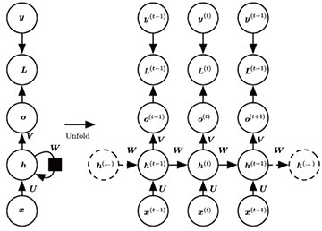 递归神经网络(Recurrentneural networks/ RNN)家族中各种结构神经网络主要用于处理序列化数据,所以一般认为递归神经网络对历史数据具有记忆性,即网络对当前输入计算输出时,既考虑当前的输入,由考虑历史输入。如图6所示,左边为未展开的递归神经网络原理示意图,右边的为展开(unfold)后的递归神经网络原理示意图。输入序列为x,输出序列为o,y 为目标输出,L为损失函数,h为内部状态,W 为网络连接权值。通过图6右侧看出,网络内部状态h 随着时间发生变化,不同于卷积神经网络,训练完毕后,网络状态处于静止状态,不会随着输入的变化而变化。