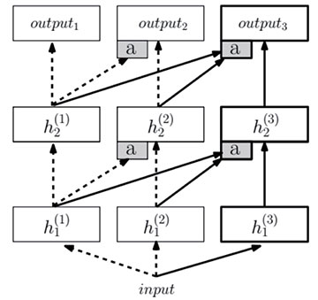 但是在一些方面,深度神经网络确实有比人脑有更强大的地方,比如深度神经网络可以具有海量的内存存储能力,轻松把人脑无法记忆的许多数据存储起来进行检索。目前情况是,使用一个类型的数据集训练得到的深度神经网络不能对其他类型的数据进行应用,神经网络的功能单一,还无法跨领域学习;但是人脑可以在不同应用领域轻松的实现跨域联想,可以在数学领域借鉴音乐美术等艺术领域的一些思想火花。在围棋战胜李世石的AlphaGo 并不会下简单的象棋或者军棋,但是人脑可以轻松的进行类似思维切换。所以近期google 的Raia Hadsell 团队使用连接的神经网络结构实验这种可以实现思维切换的通用bob半岛综合登录 (general artificialintelligence):进步神经网络(progressiveneural networks)[5],就是想打破这种功能限制,在神经网络的通用性上进行探索。如图8 所示,一个三列进步神经网络示意图,左边的两列(虚箭头)分别在任务1 和任务2 上进行训练,标a 的灰色框表示适应层(adapterlayers),附加上右边的第三列用于任务3,可以访问前面已经学习到的所有特征。
