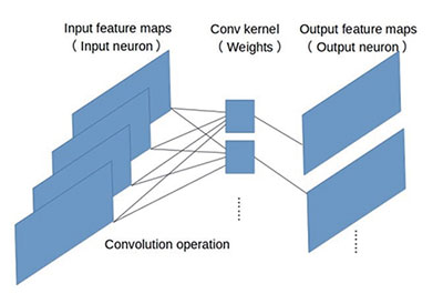 最早的卷积神经网络模型(比如LeNet和AlexNet)很是简单,如图2所示,使用堆栈式(stack)单卷积或者多卷积加单池化(pooling)的结构,卷积层做特征提取,池化层进行空间下采样。输入特征映射(inputfeature maps), 即输入神经元(inputneurons)经过带有权值(weights)的卷积核(conv kernel)进行多维卷积,在输出神经元(output neurons)上得到输出特征映射(outputfeature maps)。