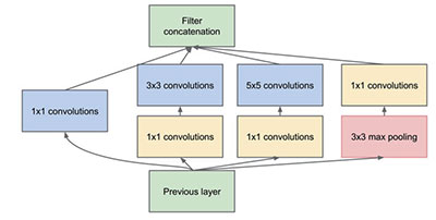 之后的卷积神经网络版本,融合了Network In Network 来增加隐层提升非线性表达,它使用1x1卷积映射到隐含空间,再在隐含空间做卷积。同时考虑到多尺度,在单层卷积层中用多个不同大小的卷积核来卷积,最后把结果串联起来得到输出特征映射。这一结构,被称之为“Incepti on”,由谷歌提出,如图3所示,代表模式有Inception-v1、Inception-v2、Inception-v3、Inception-v4等版本。