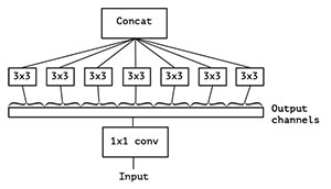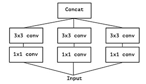 逐层可分离卷积(Depthwise SeparableConvolution)可以认为是Inception 的扩展,它是Inception 结构的极限版本,如图4所示,一个简化版本的Inception,我们可以看做一整个输入做1x1卷积,然后切成三段,分别进行3x3卷积后相连,如图5所示。图4和图5两个形式是等价的,即Inception 的简化版本又可以用如下形式表达: