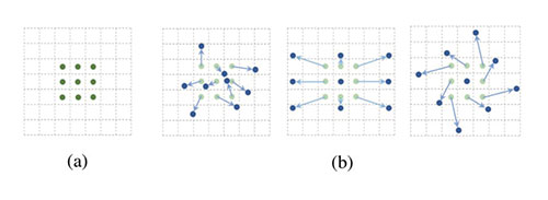 还有一种卷积神经网络称为可形变卷积(Deformable convolutions)神经网络,其思想很巧妙:它认为规则形状的卷积核(比如一般用的正方形3x3卷积)可能会限制特征的提取,如果赋予卷积核形变的特性,让神经网络根据标注标签反向传播回来的误差自动的调整卷积核的形状,适应网络重点关注的感兴趣的区域,就可以提取更好的特征。如图8所示,神经网络会根据原位置(a),学习一个偏移量,得到新的卷积像素点位置(b) 图,那么一些特殊情况就会成为这个更泛化的模型的特例,例如图(b) 中图表示从不同尺度物体的识别,图(b) 右图表示旋转物体的识别。