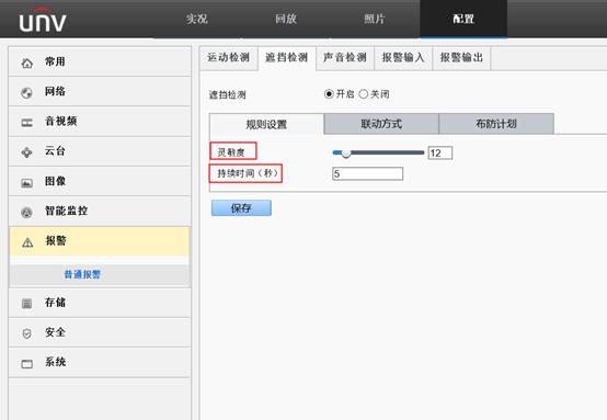3、设置灵敏度。灵敏度越高,检测到镜头被遮挡的成功率越高,同时误报率也会提高。