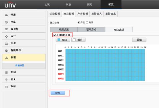 5.根据需求配置并启用布防计划,点击保存,配置完成;