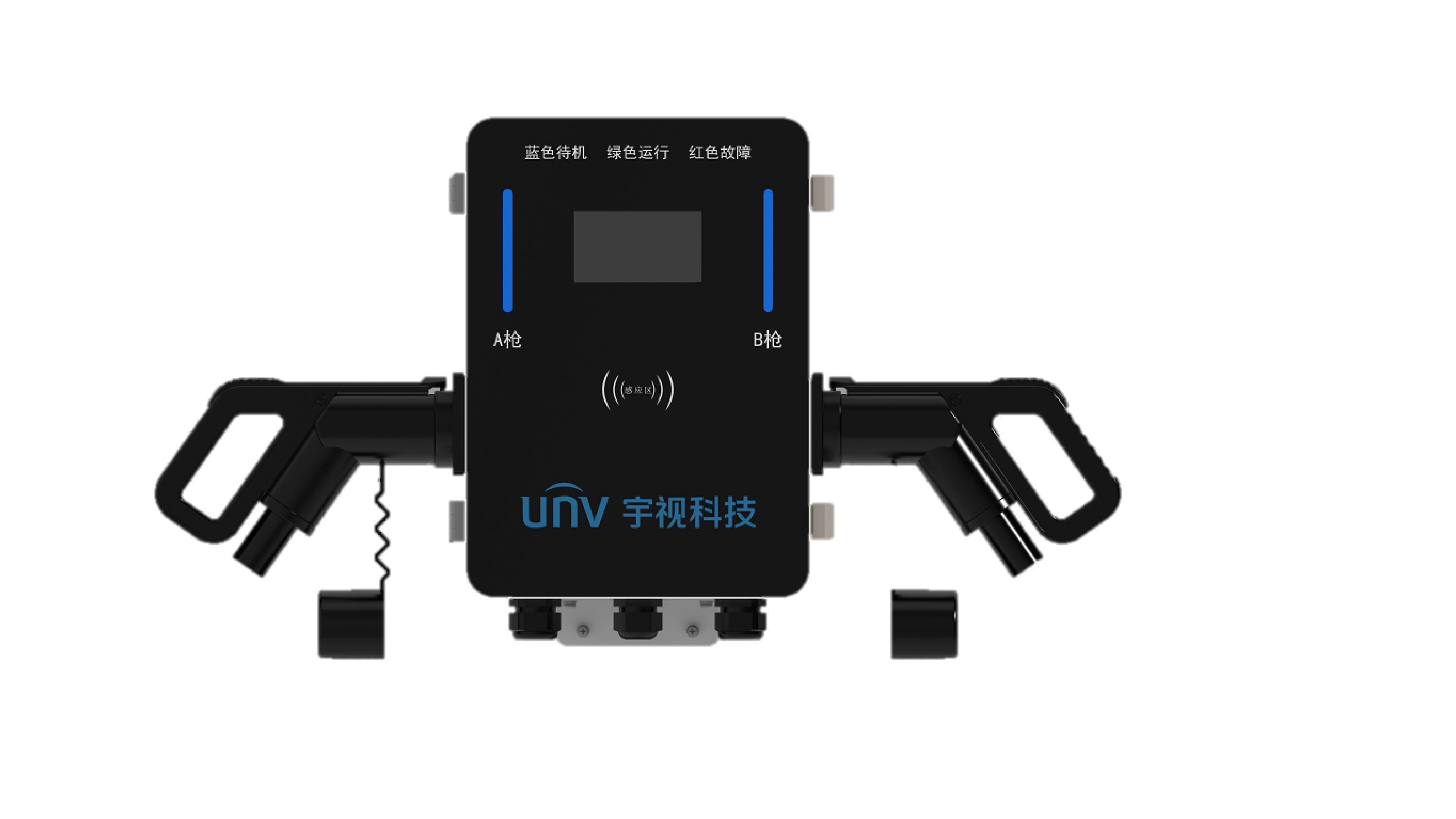 交流充电桩主要由读卡器(选配)、计量单元、触摸显示单元、控制单元、充电连接器和各保护模块等组成;读卡器单元(选配):集成读卡器模块,用于识别和验证用户信息,并开始或停止充电;