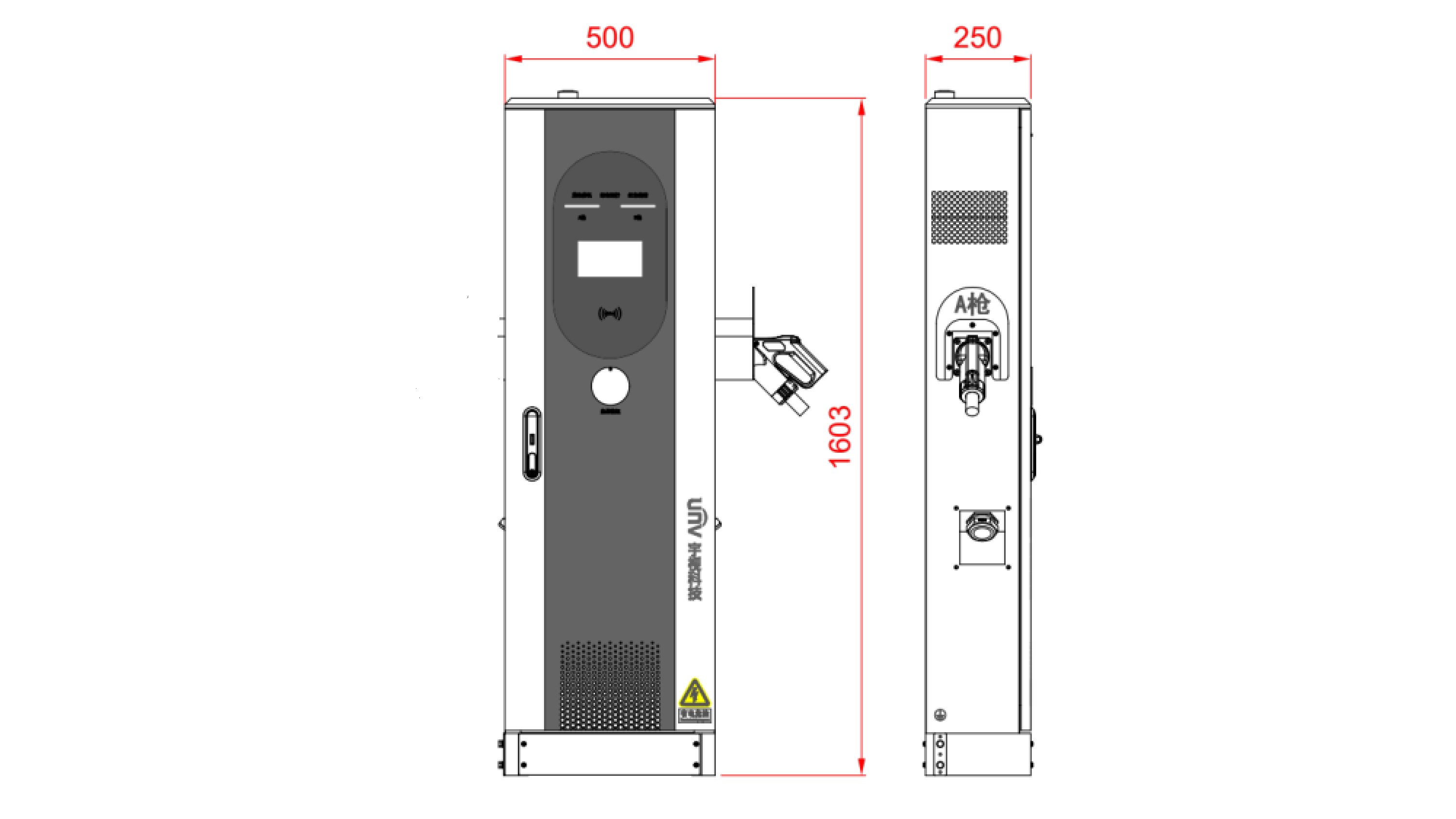 充电连接器符合国标GB/T20234.3的标准充电接口;实现不同品牌车辆的充电,实现对电池的动态管理,并且按照需求准确的调节直流充电输出;具备急停按钮,异常情况下可按下紧急停按钮,紧急停机终止充电;