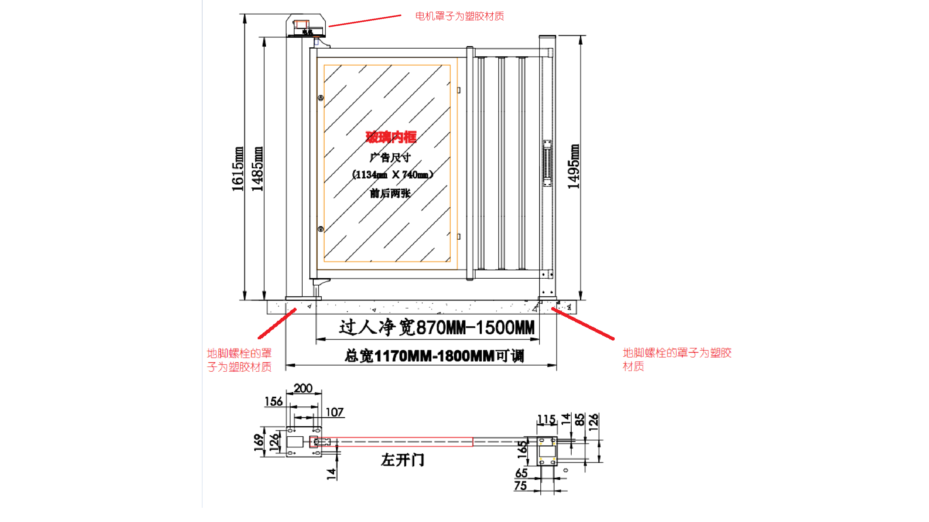 门体总宽度能够自由调节,可调范围870~1500mm;