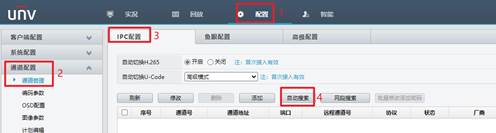 单机“配置—>通道配置—>通道管理—>IPC配置” ,点击“自动搜索”,搜索到待添加的摄像机IP地址后,可选择“一台或多台”,点击“确定”。