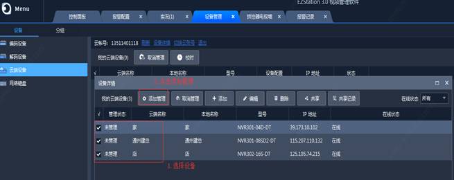登录成功后,显示云账户下的云端设备,点击【设备详情】à选择对应的设备,点击添加管理。