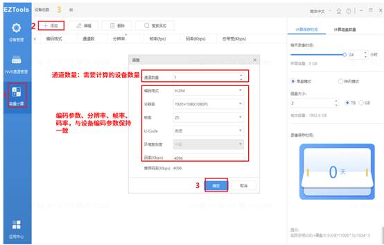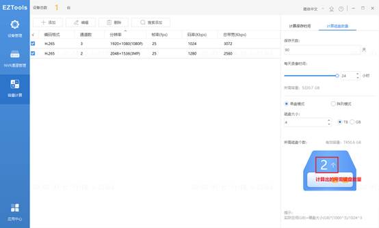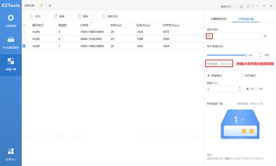 根据实际情况选择设备数量,配置保存天数、每天录像时长和硬盘的模式及空间大小,计算磁盘数量。