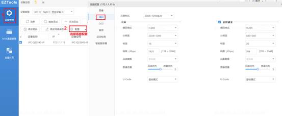 EZTools工具搜索添加设备,选择设备点击【配置>高级配置>编码】确认摄像机的编码参数。