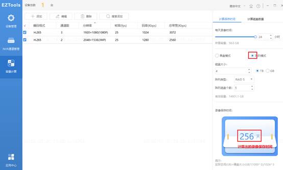 第二步:根据实际情况选择设备数量,配置每天录像时长、硬盘的模式和硬盘大小,计算录像保存时间。