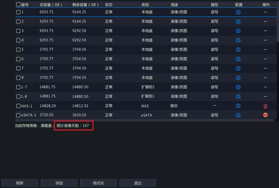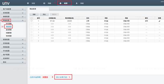 网页界面:【配置—>硬盘配置—>硬盘管理】,查看预计存储时间。